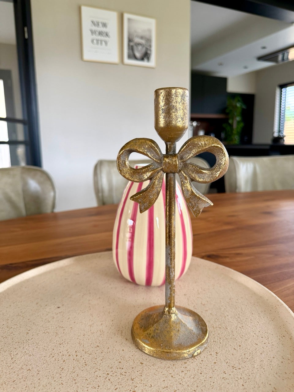 Breng warmte en karakter in je interieur met de elegante Kandelaar BOW in goud. Deze metalen kandelaar met verfijnde strikdetail is een echte blikvanger op tafel, dressoir of in een open kast. Dankzij de twee verschillende hoogtes creëer je eenvoudig een speels en stijlvol geheel, perfect als set, maar ook prachtig als los statement.