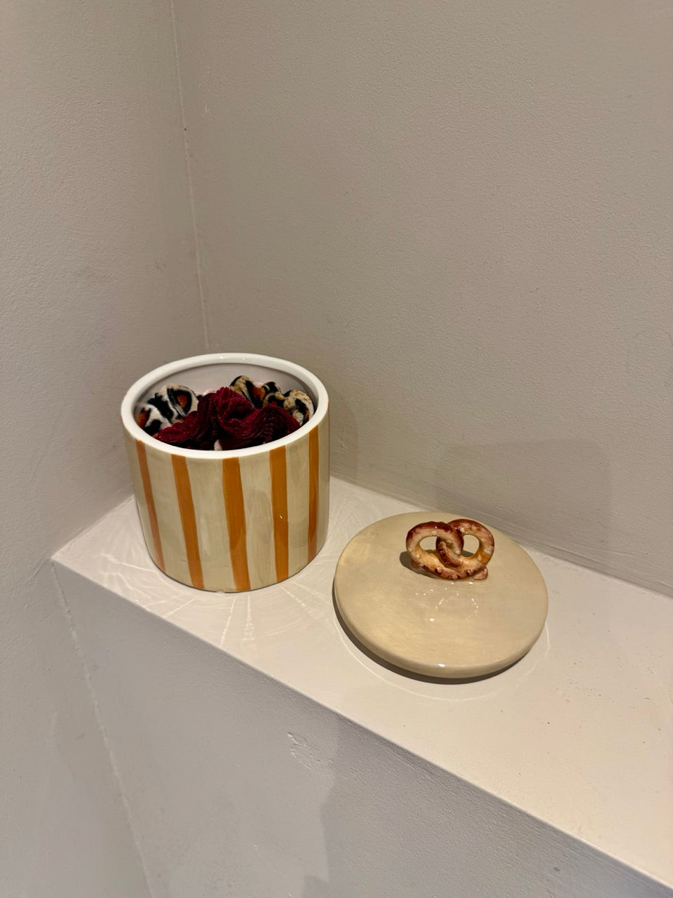 De Opbergdoos Bakery Collection combineert warme bruintinten met speelse details: een strik, croissant en pretzel als dekselknop. Perfect als decoratief opbergdoosje én als subtiele eyecatcher in je interieur.