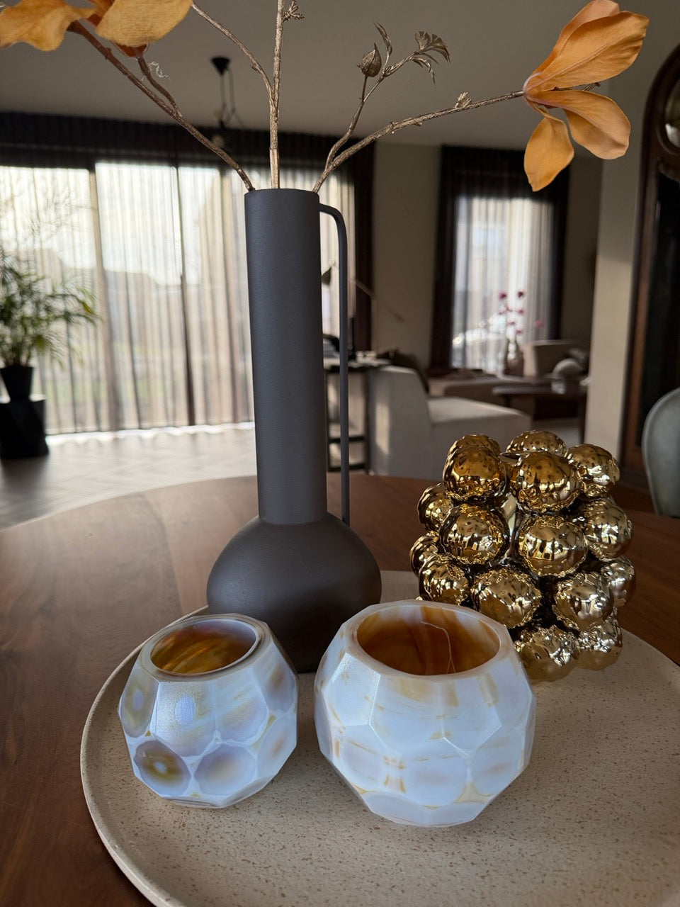 Deze Shop the Look set draait om balans: mat bruin, zandkleurig metaal en glanzend goud versterken elkaar zonder te overheersen. De hoge vaas met decoratieve tak zorgt voor hoogte en elegantie, terwijl de gouden vaas en glazen theelichthouders warmte en sfeer toevoegen. De decoratieschaal vormt de rustige basis die alles samenbrengt tot één harmonieus geheel.