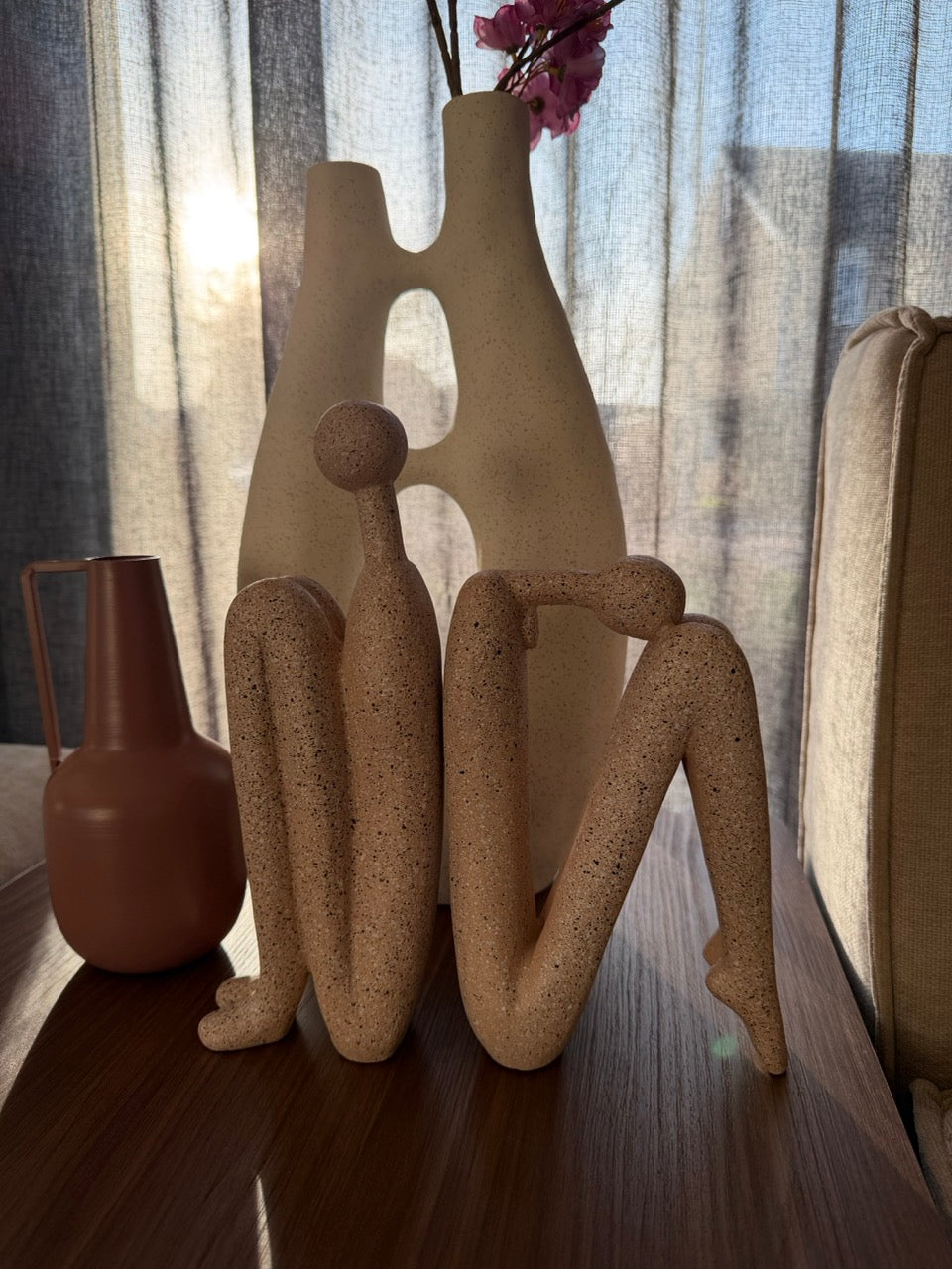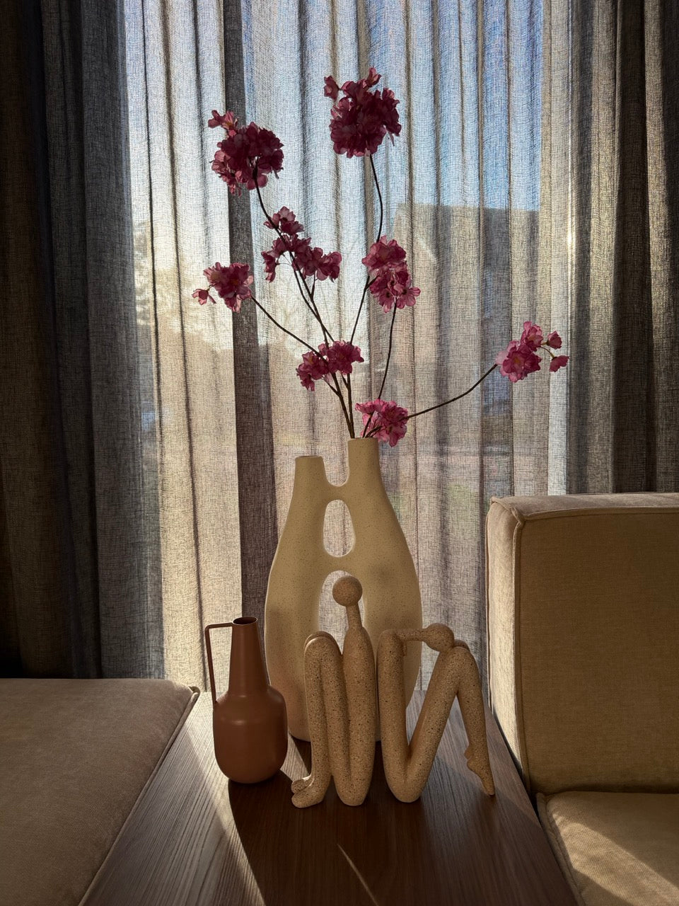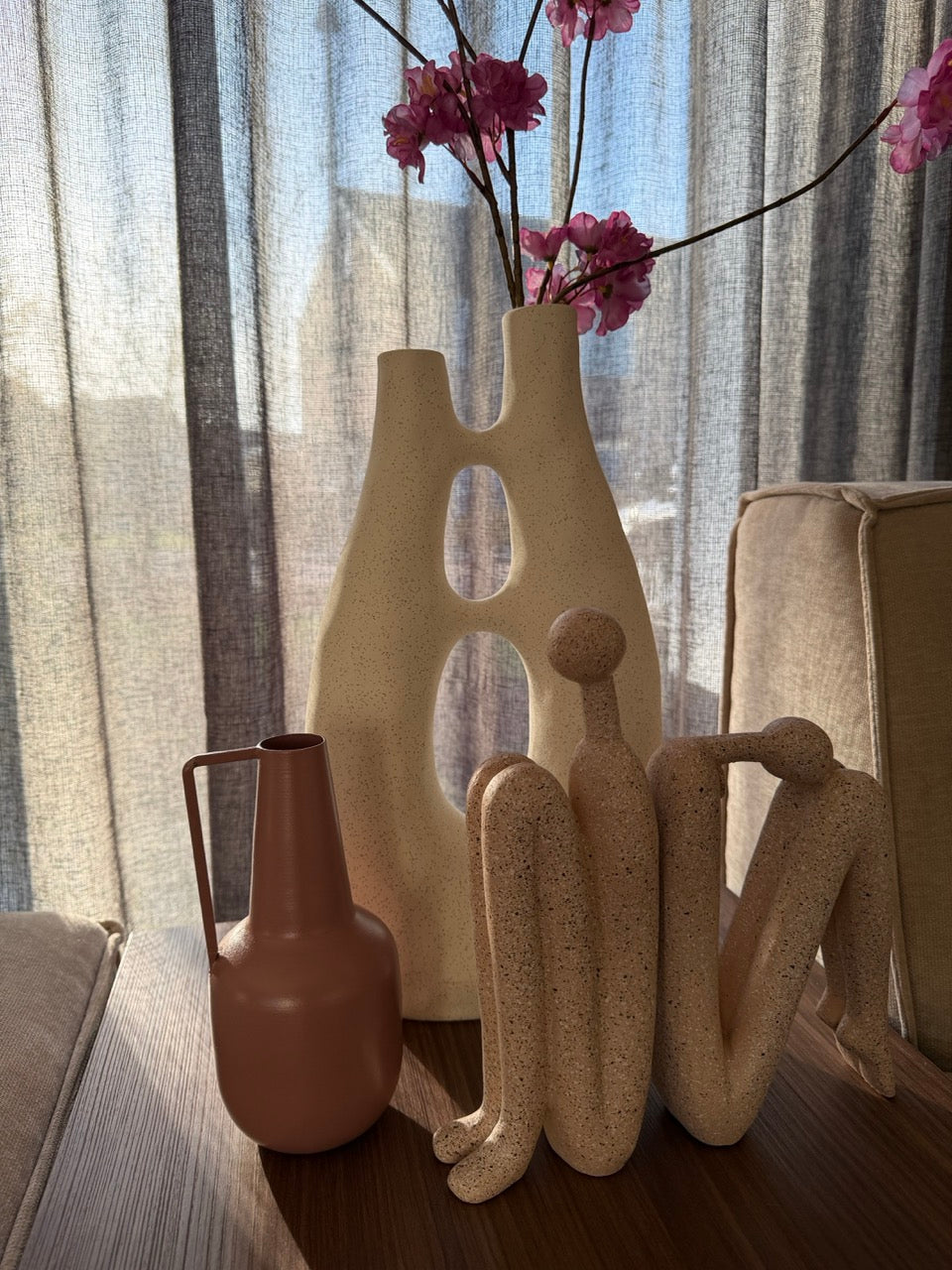 De Soft Statement set draait om zachte vormen en een rustige uitstraling met karakter. De sculpturale vaas vormt het middelpunt en krijgt extra diepte door de combinatie met een modern ornament en een verfijnde vaas in warme aardetint. Samen zorgen ze voor een harmonieuze styling die moeiteloos past binnen een modern, Japandi of warm minimalistisch interieur.